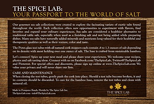 - COLLECTION: The Gourmet salt collection includes 11 of the best tasting hard to find salts, they are housed in the best Pyrex test tubes with all natural cork stoppers.