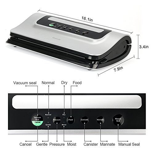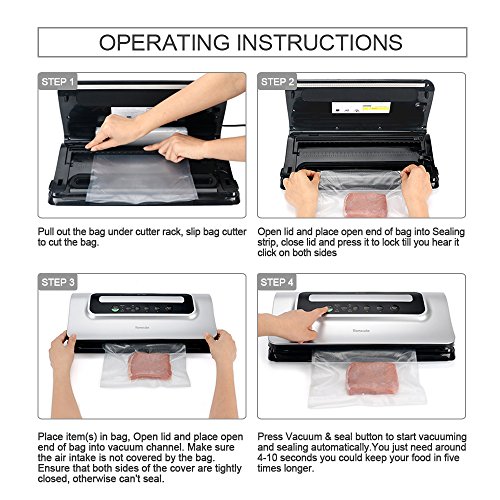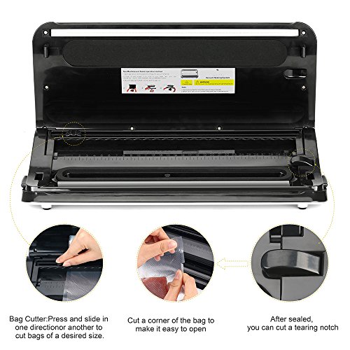 HUMANIZED DESIGN - Packings include five free vacuum bags(9.8” x 11.8”)and one extra long vacuum bag roll (9.8” x 196”). For operation convenience, you can easily adjust length at your needs with built-in cutter.Specialized corner bag cutter to cut a corner of the bag to make it easy to open.Low noise, low vibration, low power consumption, solid structure.