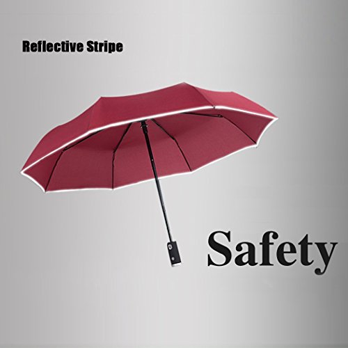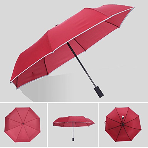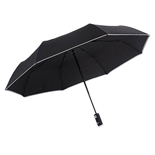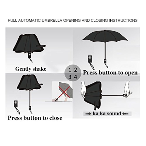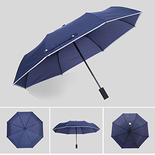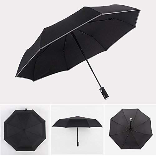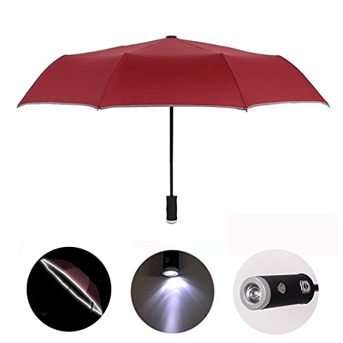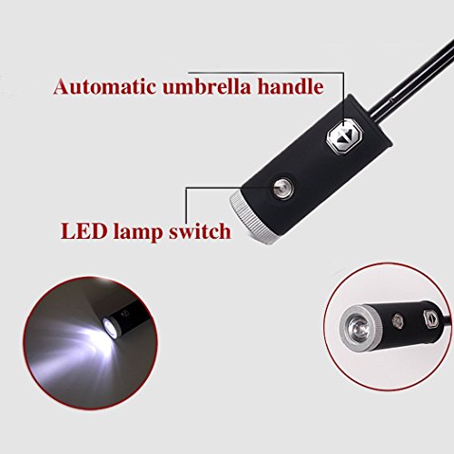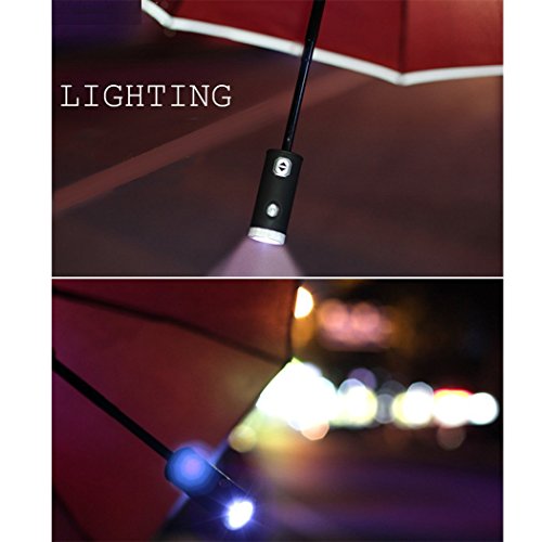 -. Feature : 1.SAFETY DESIGN: The reflective stripe makes you visible walking in darkness, safety guaranteed. Both rain and UV protections. / 2.AUTOMATIC OPEN / CLOSE: Quickly open and collapse the canopy with the push of a button. Collapsing the canopy is only a button's push away as well. When you get caught in an unexpected downpour, you won't look like wet dog by opening the umbrella in less than a second / 3.LIGHT HANDLE: This light is below the umbrella handle. It will illuminate your path and is moveable to different direction while you walking at night to keep you safe. Of course, it is also quite good for camping. One pieces of button cells are needed for it. / 4.HIGH WINDPROOF: Laser penetration holes, pongee cloth, black electric ribs with double later, enhances it's windproof and sturdy effect. / 5.CONVENIENT TO CARRY: Compact umbrella with a 44-inch canopy, 11.5-inch close length. This mini, lightweight and folding umbrellas is designed to fit in briefcases, backpacks, travel totes, and the glove compartment of your car. This also comes with a handy storage sleeve