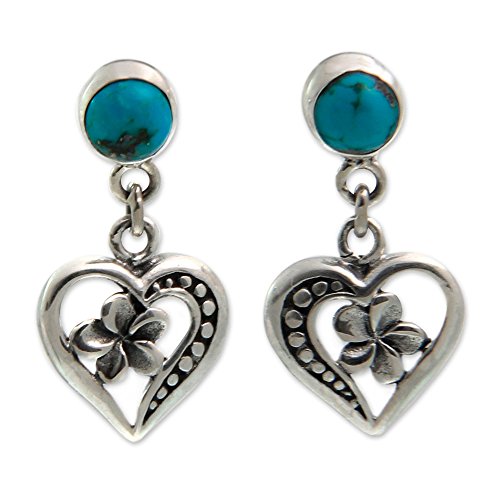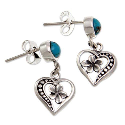 About this item: Blue dewdrops make frangipani blossom inside of hearts for the romantic design of these earrings. Ngurah Gede crafts the .925 sterling silver dangle earrings by hand and crowns them with reconstituted turquoise cabochons. The earrings swing from sterling silver posts with butterfly clasps. Earrings measure 0.9" by 0.4".