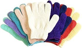 - For Men and Women. Nylon exfoliating gloves. Colors may vary depending on stock availability. Best bath and shower gloves for removal of dead skin cells, skin rejuvenation, wrinkle, scar and cellulite reduction.