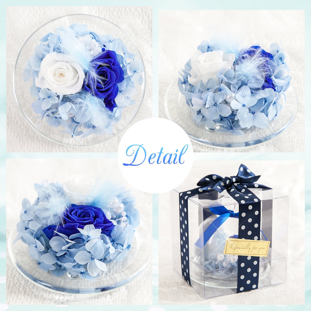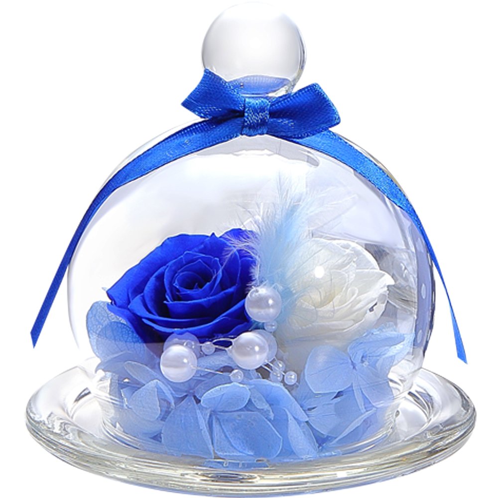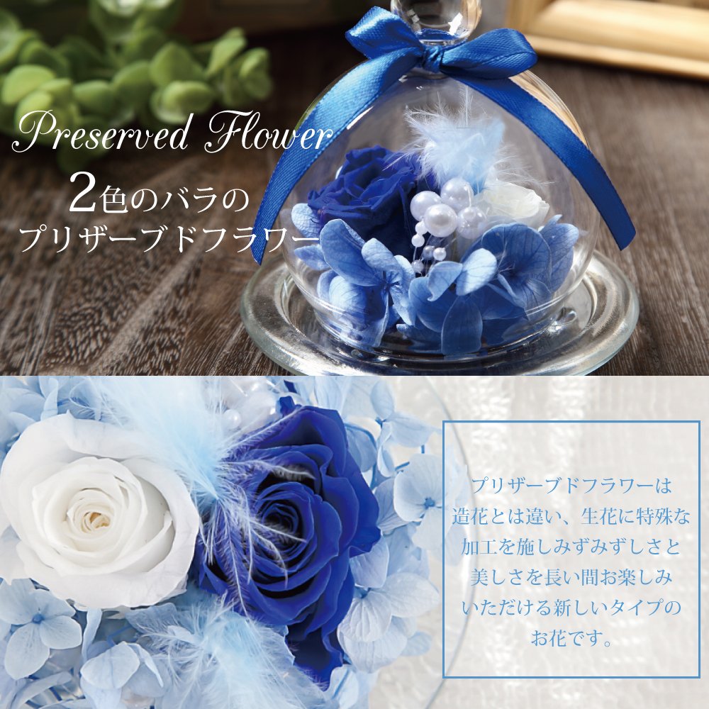 2~3cmのロイヤルブルーのバラ1輪と白のバラ1輪、紫陽花、羽根、パールビーズでアレンジしたガラスドームアレンジ。小さめのガラスポットの中にお花がいっぱい詰め込まれているTEATSIGHTオリジナルのアレンジです。