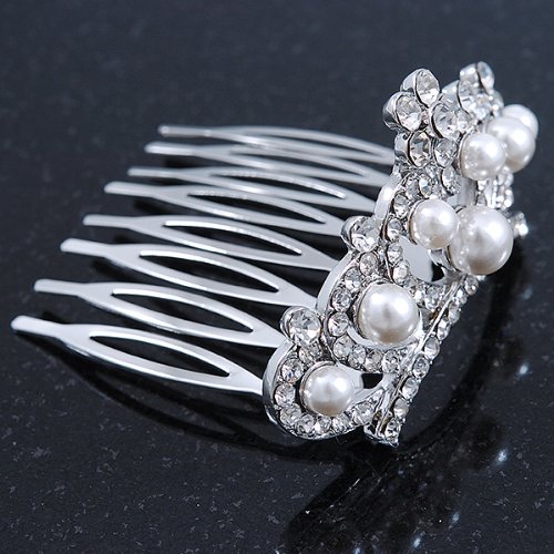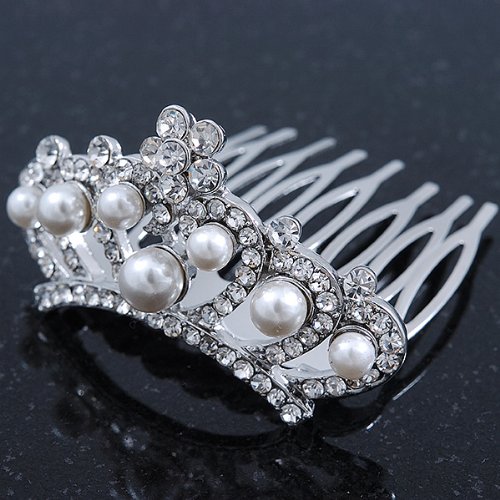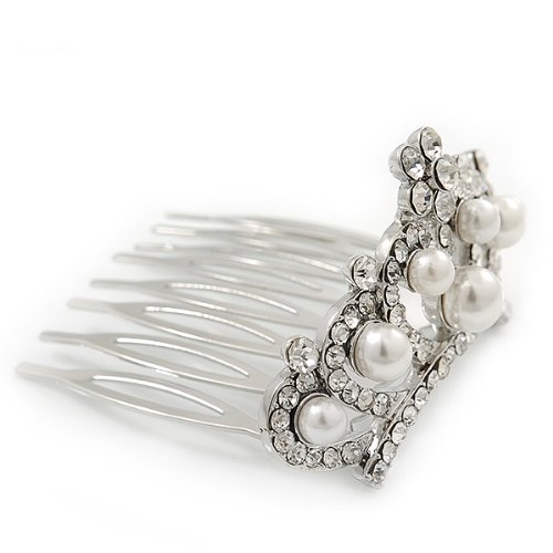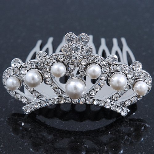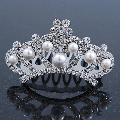 The cutest miniature tiara comb fit for a real Princess? Oh yes please! Slip this gorge mini comb tiara into your hair for an enchanting look. Featuring a rhodium plated hair comb decorated with clear Swarovski crystals and white acrylic pearls. The tiara is approximately 50mm across and is approximately 25mm in height. Sparkle away on your special day with this tiny delight!Feature