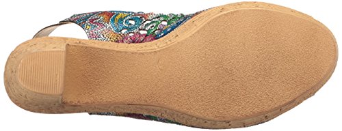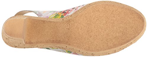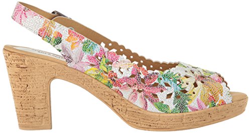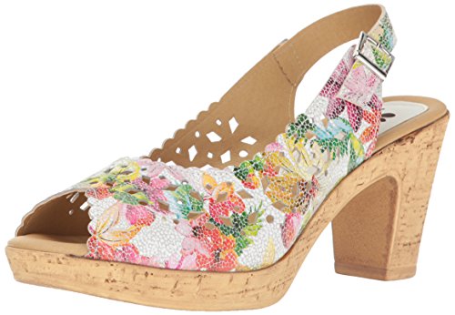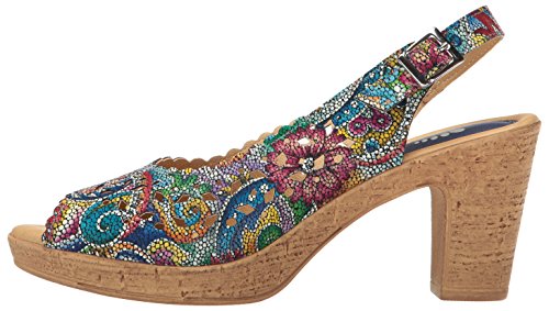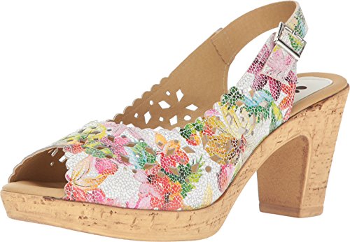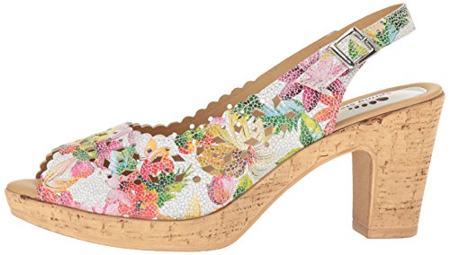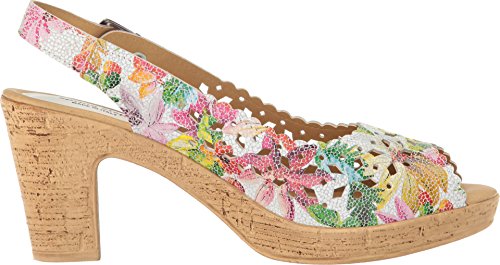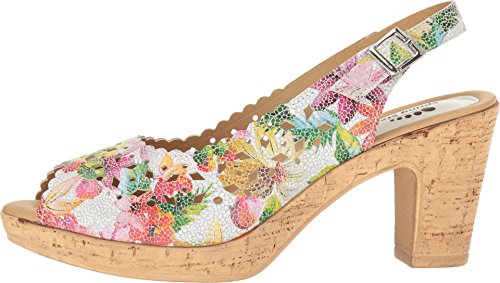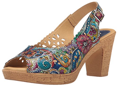 Product DescriptionBrightly colored floral printed leather laser-cut peep-toe sandal with a feminine scalloped topline.0