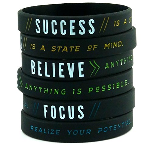 -. Feature : Pack of 6 "Success, Focus, & Believe" silicone wristbands with motivational phrases / Standard adult size of 8" around; Classic unisex design is suitable for both men and women / Includes 2 each of: "SUCCESS IS A STATE OF MIND." / Includes 2 each of: " FOCUS: REALIZE YOUR POTENTIAL." / Includes 2 each of: "BELIEVE: ANYTHING IS POSSIBLE."