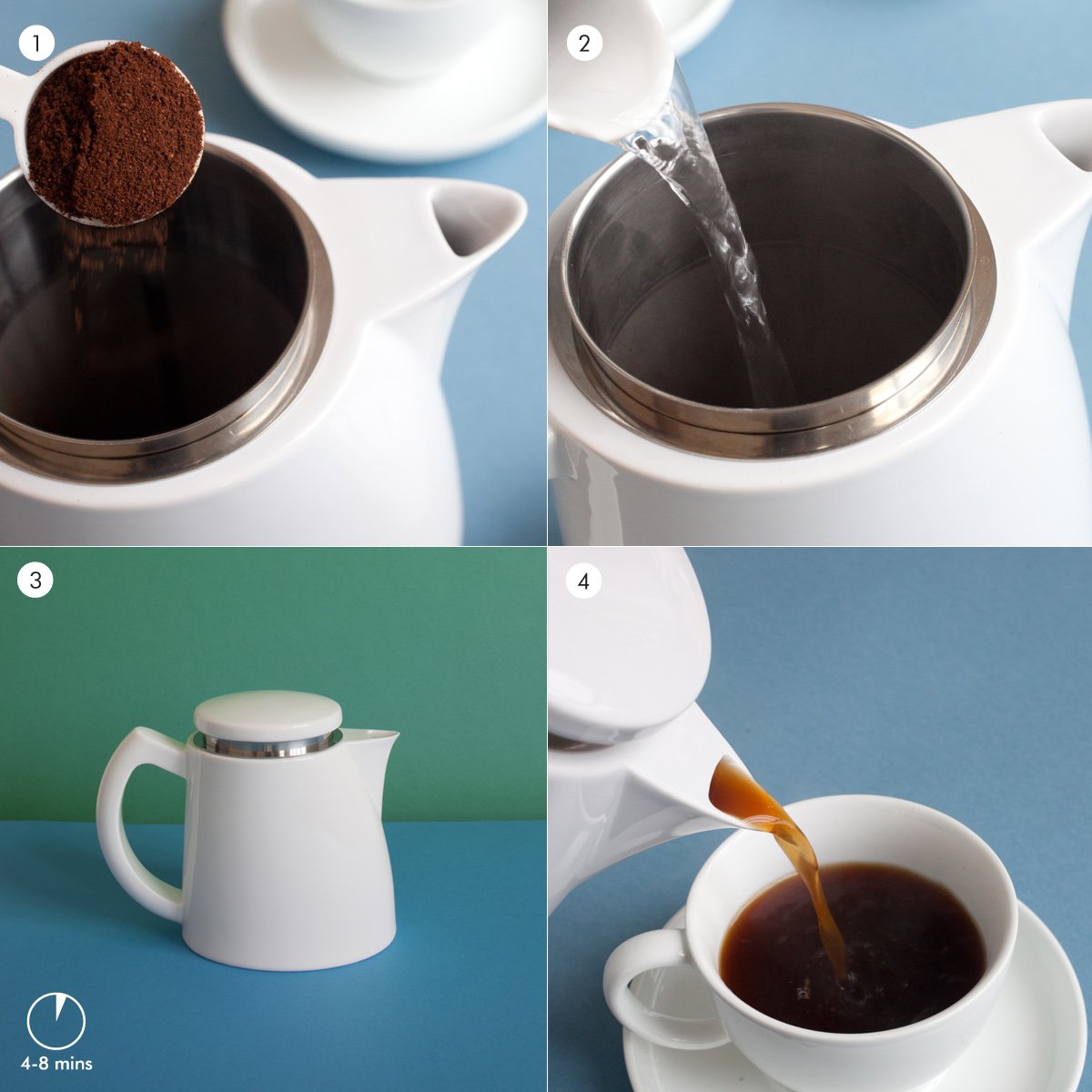 Easy to clean; All parts dishwasher safe; High quality porcelain; 18/8 Stainless steel filter; Slow pour spout