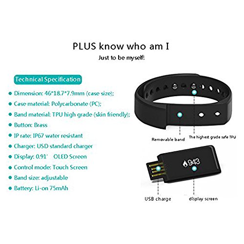 - Feature : Light Weight;Touch design;Waterproof IP67;Cloud social circle interaction / Display Health Parameters;APP of the new revision;Synchronize Data;Caller ID and message / Movement monitoring;Sleep monitoring+Alarm clock reminder;Snyc Sports Data, Share with Friends / Self-timer artifact;Looking for mobile phones;Sedentary Reminder / Built-in USB Charging;Indicator Light;Light Weight