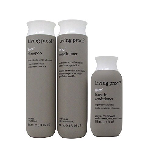 -. Feature : Bundle 3 items: Living Proof No Frizz Shampoo & Conditioner, 8 oz & No Frizz Leave-in Conditioner, 4 Oz / Living Proof No Frizz Shampoo & Conditioner, 8 oz: Weightlessly block humidity 70% better than silicones and oils. Fights the two main causes of frizz: humidity and friction. Smooth hair texture so strands are polished and frictionless. Keep hair cleaner, longer allowing you to wash your hair less often. / Living Proof No Frizz Leave-in Conditioner, 4 Oz: Repels dirt and oil allowing you to wash your hair less often. Nourishes and provides optimum moisture levels. Fights the two causes of frizz: humidity and friction.
