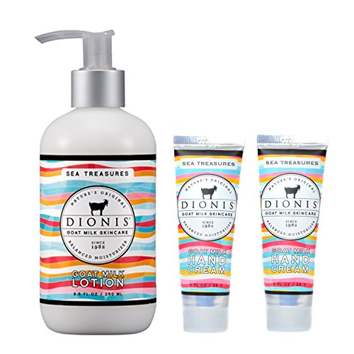 Three item set that includes one 8.5-ounce Goat Milk Body Lotion and two 1-ounce tubes of Goat Milk Hand Cream in "Sea Treasures" scent.
