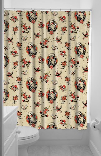 - Traditional tattoo inspired, tea-colored shower curtain features a sailor girl, smokin' skull, rose & sparrow pattern.