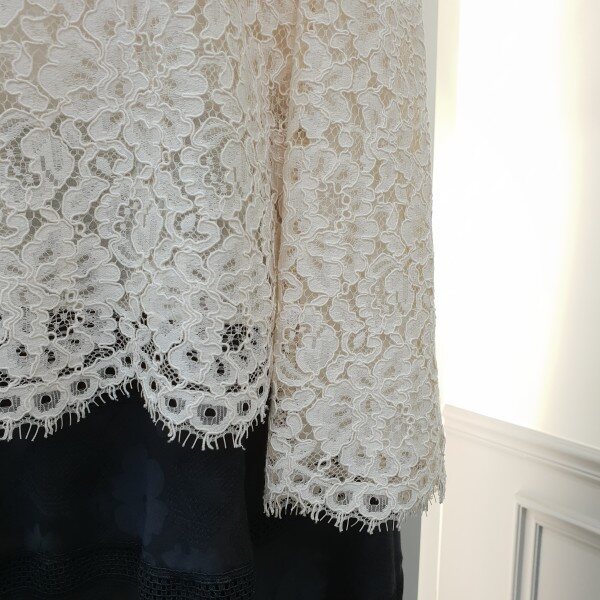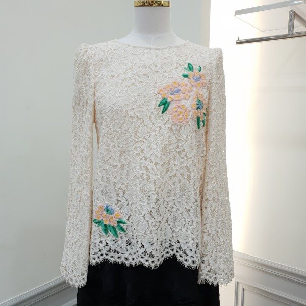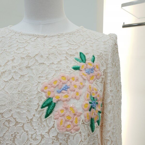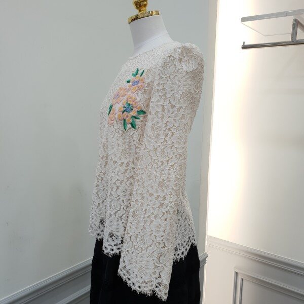 레이스원단에 컬러감이사랑스러운 꽃모양자수가 포인트입니다~♡스칼랍단처리가되어있어 고급스럽습니당