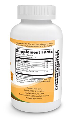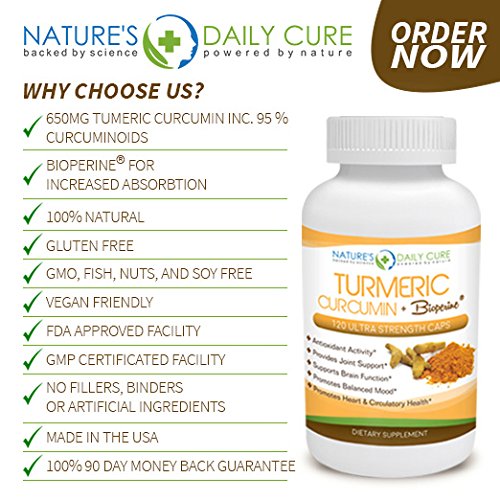 - Feature : * Supports Whole-Body Health: Contains turmeric curcumin, reported to be a natural anti-inflammatory with powerful joint, heart, skin & brain health benefits. / * High-Potency Formula: Larger capsule size delivers 650mg of turmeric with 95% curcuminoids for a jumbo dose of these beneficial antioxidants! / * Enhanced Bioavailability: Includes 5mg of Bioperine, a black pepper extract found to facilitate the absorption of turmeric & improve results. / * Safe & All Natural: Quality-tested in an FDA-approved, GMP-certified facility. Gluten-free & GMO-free. No fillers, binders or fake ingredients! / * 90-Day, 100% Money Back Guarantee: If you're not happy, neither are we. Should you have any problems, let us know and get a full refund.