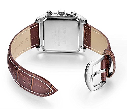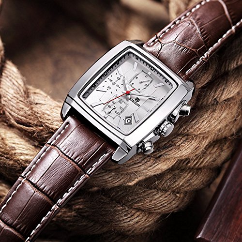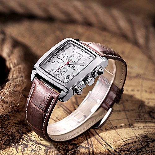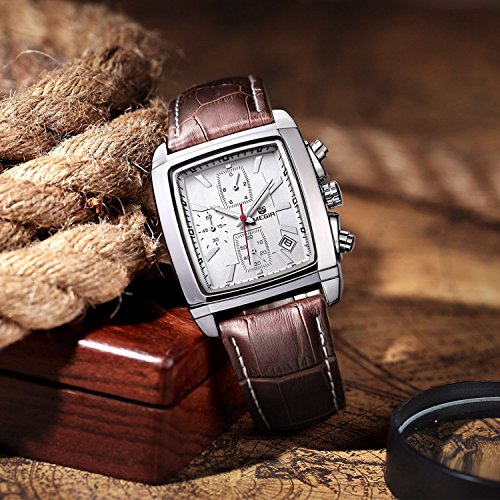 -. Feature : カレンダー付き:日付表示。針に夜光インデックス機能が付いており。暗い環境に居ても時間を見やすい。クロノグラフ機能があります。(トリブルダッシュボード)ベゼルサイドの竜頭 は、上:ストップウォッチ開始、停止。中:日付・分針調整。下:ストップウォッチリセットの機能があります。 / 文字盤にThree eyesデザインを採用され、レーシング車のようでスポーツ感が強くてとてもファションな腕時計です。また、ケースの形はスクエアフェイスのため、レトロファションスタイルも感じできます。ベルトが肉厚でステッチも入っているので、いい 風合い、高級感をかもしだしています。 / 精度の高いクオーツムーブメントです。 / 30メートル日常生活防水 (手洗いスプラッシュだけ、雨に濡れるな、シャワー・水泳・ダイビング等には対応していません) / 本体サイズ: 直径:39*37mm  厚み:12mm  ケース素材:合金 バンド素材:レザー 風防素材:強化ミネラルガラス