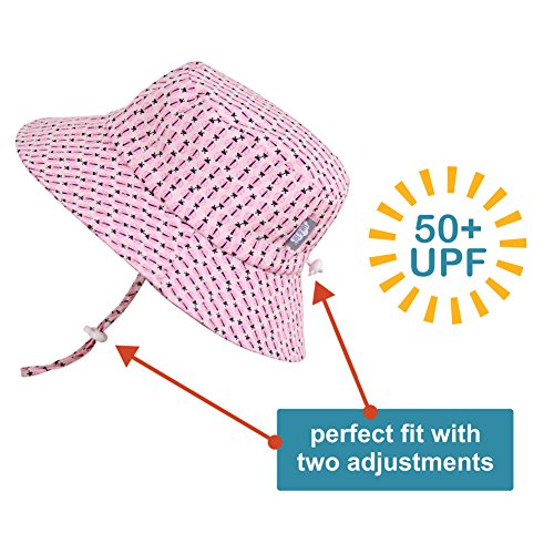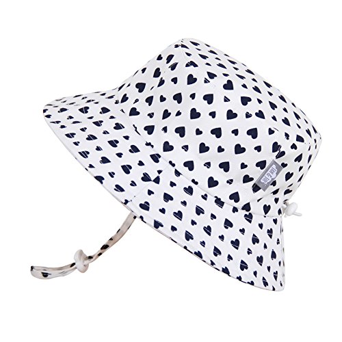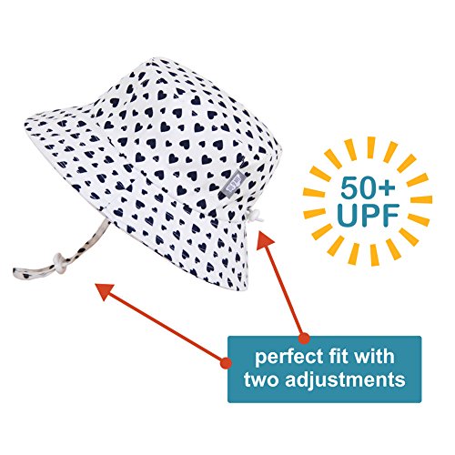 Toddler Sun Hat with Chin Strap, Adjustable Head Size, 50+ UPF Cotton ( Bucket M: 6-18m, hearts )