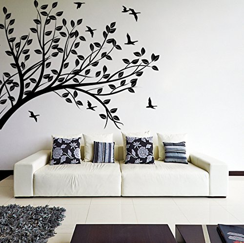 -. Title : (24'' x 18'') Wall Decal Tree silhouette Branch with Leafs & Birds / Nature Art Decor Sticker / Forest DIY Mural + Free Random Decal Gift