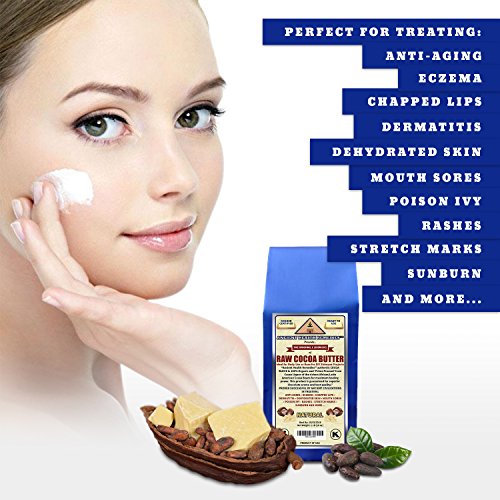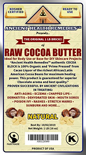 Studio : Ancient Health RemediesTM Publisher : Ancient Health RemediesTM Binding : Misc. Product Description Buy Ancient Health RemediesTM Lowest Price, Best Quality, Authentic, All Vegan, Bulk, Fair Trade, Edible, Raw, Stimulating Chocolate Aroma, Prime Pressed, Kosher Organic COCOA (Cacao) BUTTER with Amazon's 'Satisfaction Guarantee allowing you to purchase with confidence and free Prime shipping. Our superior quality, Kosher Certified, Raw COCOA BUTTER has been clinically effective in treating Anti-Aging (Wrinkled Skin), Baby Rash Treatment, Chapped Lips, Dehydrated Skin, Dermatitis (Dry Skin), Eczema, Hair Loss, Mouth Sores, Sensitive Skin, Stretch Marks, Rashes, Raw, COCOA BUTTER is also the best choice on the market for Handmade and Industrial Manufacturers of Organic Skincare Products. Best All-Natural Cosmetics, Anti-Aging Cream, Babies Skincare Products, Body Massage Oils, Body Lotion Making, Body Moisturizers, Handmade Body Butter, Healing Salves, Lip Balms, Organic Skincare Beauty Products, Natural Hair Products, Skin Moisturizers, Stretch Creams, and Soap Making Supplies. Unlike popular products like Palmer's Oil, this Cocoa is free of any deodorizing detergents, Isopropyl Myristate, artificial fragrances, sulfates and other alcoholic additives commonly blended into over the counter skincare products. IMPORTANT: ALL RAW COCOA BUTTER IS NATURALLY HARD IN ITS SOLID FORM and will be need to be cut/melted from 1 lb block. EVERYONE should use Raw COCOA BUTTER for healthy, youthful and rejuvenated feeling skin. After surgeries and maternity operations, most medical physicians will suggest applying raw Cocoa Butter to heal the incision and prevent future scars. Our Raw, COCOA BUTTER is the best all natural, organic alternative to popular, chemical based skincare creams and synthetic Cocoa Oils commonly sold in stores. Try yours today...hassle free, money back guaranteed and best legitimate price on Amazon.com. From 'Ancient Health RemediesTM', a company dedicated to the research and manufacture of the most successful, organic ancient health remedies of all time. 0