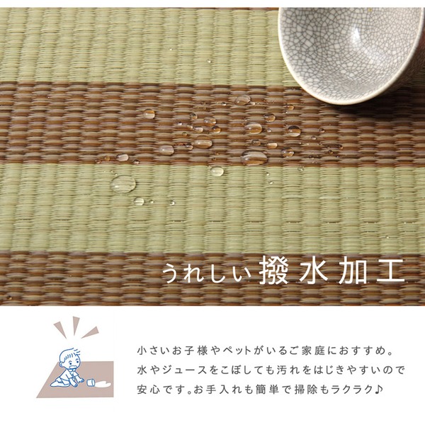 本商品はお取り寄せ商品のため、稀にご注文入れ違い等により欠品・遅延となる場合がございます。誠に恐れ入りますが、何卒ご了承ください。 また、以下の場合には追加送料がかかる場合がございます。  ・沖縄、離島および一部地域への配送時 ・同梱区分が異なる商品の複数購入時  【出荷目安】:1 - 5営業日 ※土日・祝除く 【同梱区分】:TS 1678 【梱包サイズ】:通常商品   格子柄のシンプルない草ラグです。中材にはウレタンフォームを5mm使用し、ふっくらとしたふみ心地に仕上げました。フローリングでも底付き感を軽減してくれます。表地には撥水加工を施すことでちょっとこぼしてしまっても、さっと拭き取って清潔にご使用いただけるようにしました。またい草には空気の自然浄化作用、湿度の調節作用などがあります。こちらの商品はい草に青森ヒバ加工を施しています。(抗菌、防臭効果)  【素材】表地=い草 ※普通織 ※はっ水加工 中材=ウレタンフォーム5mm 裏地=ポリエステル100%【不織布】 ヘリ=ポリエステル100% 【サイズ】約190×190cm 【原産国】中国製 【洗濯表示】洗えません。 【適応サイズ】2.3畳  【配送日時指定について】 ・この商品は、配送希望日と時間帯をご指定可能です。 ・配送希望日は出荷目安(最長)の 2 - 30 日後の間でご指定ください。 ・最短でのお届けをご希望の場合は「指定なし」を選択してください。 ※配送エリア(例:沖縄・離島)により、配送希望日のご指定をお受けしかねる場合がございます。