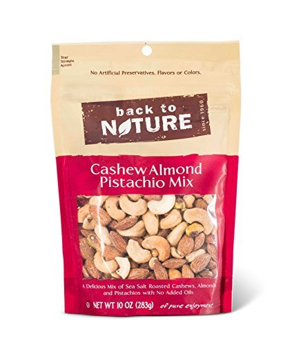 -. Binding : Grocery -. Brand : Back to Nature -. EAN : 0819898013142 -. Feature : A Delicious Mix of Sea Salt Roasted Cashews, Almonds and Pistachios with No Added Oils -. IsAdultProduct : 0 -. Label : Back to Nature -. LegalDisclaimer : This P.R.Ice is for one 9 ounce pkg Actual product packaging and materials may contain more and different information than what is shown on our website. We recommend that you do not rely solely on the information presented and that you always read labels, warnings, and directions before using or consuming a product -. Manufacturer : Back to Nature -. NumberOfItems : 1 -. PackageQuantity : 1 -. ProductGroup : Grocery -. ProductTypeName : GROCERY -. PublicationDate : 2016-04-25 -. Publisher : Back to Nature -. ReleaseDate : 2016-04-25 -. Size : 9 Ounce -. Studio : Back to Nature -. Title : Back to Nature Cashew Almond Pistachio Mix, 9 Ounce -. UPC : 819898013142
