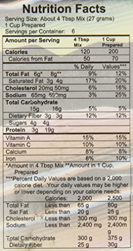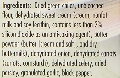 - Ingredients include dried green chiles, unbleached flour, dehydrated sweet cream, butter powder onion, dehydrated onion, dehydrated carrots, dehydrated celery, dried parsley, granulated garlic, black pepper