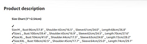 Product Description Size Chart (1"=2.54cm) ? Size:M _ Bust:96cm/37.8" _ Shoulder:42cm/16.5" _ Sleeve:61cm/24.0" _ Length:68cm/26.8" ?Size:L _ Bust:100cm/39.4" _ Shoulder:43cm/16.9" _ Sleeve:62cm/24.5" _ Length:70cm/27.6" ?Size:XL _ Bust:104cm/41.0" _ Shoulder:44cm/17.3" _ Sleeve:63cm/24.8" _ Length:72cm/28.2" ?Size:XXL _ Bust:108cm/42.5" _ Shoulder:45cm/17.7" _ Sleeve:64cm/25.0" _ Length:74cm/29.1" ?Specifications: ? ?Gender:Men ?Item Type:Shirt ?Material:Cotton Blend ?Sleeve Length:Long ?Shirts Type:Regular ?Closure Type:Regular ?Style:FashionSport ?Package include:1PC Tops0