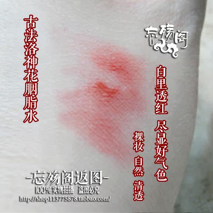 来自店主的吐槽:各位习惯用口红唇彩的三次元买家请理性购买啊!!注意这是胭脂水啊胭脂水!!这款洛神原料是鲜花!不含有化学物质!!不可能做到完全不脱妆和十分显色的!!要不然怎么是古法胭脂呢!要绝对不脱妆显色你可以去买雾面口红!!明确告诉你这是凸显最日常自然的效果!!!脸颊唇部都可以用!如果极度显色做腮红用那脸蛋不就变成了猴子屁股啊!!