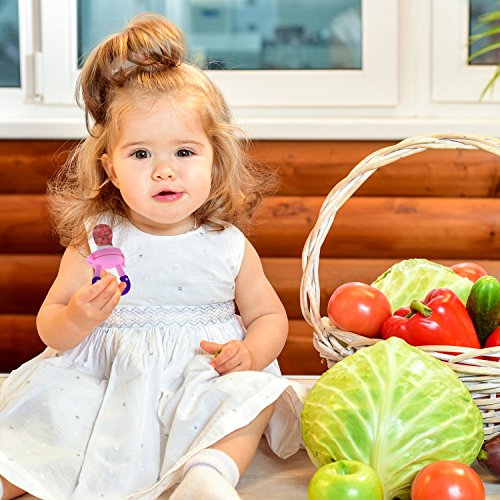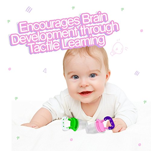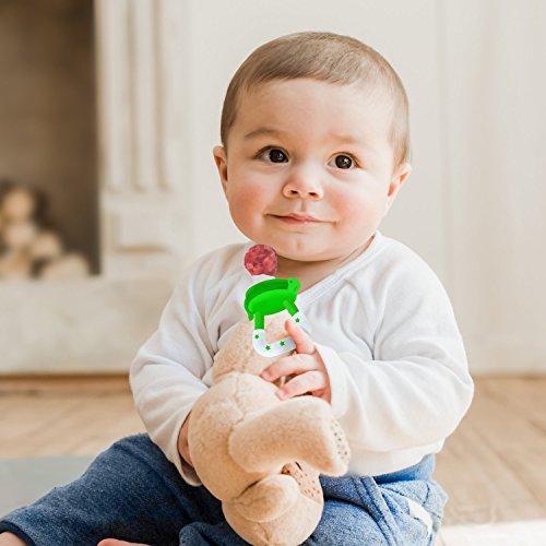 UNIQUE DESIGN -- These baby fruit suckers are engineered to allow only the tiniest of food pieces to go through to prevent choking. It is a safe way to start introducing baby to solid food as your child goes through the teething phase. It is also designed with textured surfaces and soft chewable silicone that ease teething discomfort