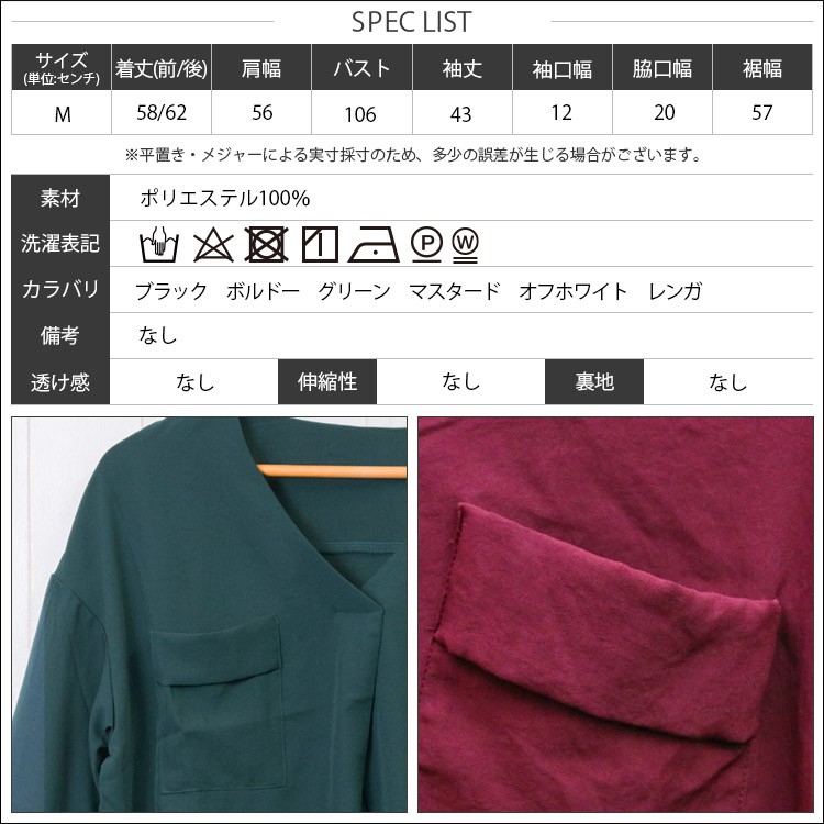 実寸:着丈(前/後) 58/62cm バスト 106cm 肩幅 56cm 袖丈 43cm 袖口幅 12cm 脇口幅 20cm 裾幅 57cm