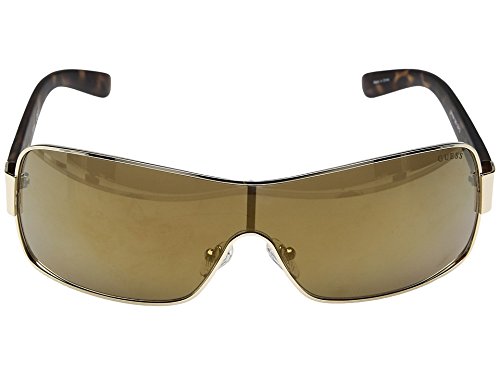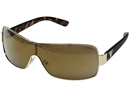 Shield sunglasses with metal frame and plastic arms. Logo-embossed triangle at temples.