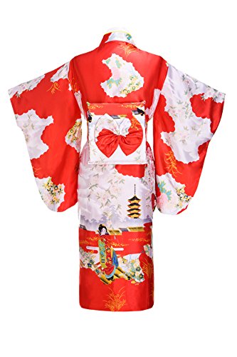 Old-to-new Women's Silk Traditional Japanese Kimono Robe with Pagoda Print Red