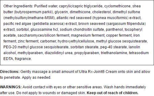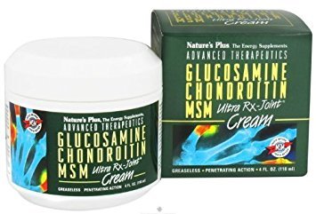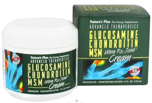 Ultra RX Joint Cream Glucosamine Chondroitin MSM-Jar by Nature's Plus 4 oz Jar Ultra RX Joint Cream Glucosamine Chondroitin MSM-Tube 4 oz Jar Product Nature's Plus Advanced Therapeutics Glucosamine Chondroitin MSM Ultra Rx-Joint Cream is precisely calibrated topical formula that synergistically combines pure glucosamine chondroitin and methylsulfonylmethane (MSM). Each penetrating drop is then formulated with a proprietary botanical nutrient-rich base which includes silicon magnesium copper zinc and shea butter for maximum benefits. Other Ingredients Purified water Caprylic Capric Triglyceride Cyclomethicone Shea Butter (Butyrospermum parkii) Glycerin Dimethicone Cholesterol Dimethyl Sulfone (Methylsulfonylmethane - MSM) Atlantic Red Seaweed (Hypnea musciformis) Extract Pacific Red Algae (Gelidiella acerosa) Extract Brown Seaweed (Sargassum filipendula) Extract Sorbitol Glucosamine HCl Sodium Chondroitin Sulfate Panthenol Tocopheryl Acetate Saccharomyces Silicon Ferment Magnesium Ferm