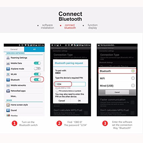 -. Feature : 【Excellent Compatibility】- Compatible with all Gasoline vehicles in OBDII interface, which support 9 OBDII protocols: 1.SAE J1850 PWM(41.6Kbaud) 2.SAE J1850 VPW(10.4Kbaud) 3.ISO9141-2(5 baud init,10.4Kbaud) 4.ISO14230-4 KWP(5 baud init,10.4 Kbaud) 5.ISO14230-4 KWP(fast init,10.4 Kbaud) 6.ISO15765-4 CAN(11bit ID,500 Kbaud) 7.ISO15765-4 CAN(29bit ID,500 Kbaud) 8.ISO15765-4 CAN(11bit ID,250 Kbaud) 9.ISO15765-4 CAN(29bit ID,250 Kbaud). (Not support Hybrid or electric vehicles) / 【Suitable for system】 Mainly used with Android system phones, also supports Symbian system phones, Windows system PCs and laptops. Compatible App: Recommended Apps are Torque Pro, Torque Lite (free), OBD Car Doctor (free), etc. on Google Play. Work with Android cellphone and tablet. Or There are various Apps and installation instructions provided on the CD. But Partial Apps need to be charged. You can run the CD to select the appropriate App. / 【Smart Scanning】 Read diagnostic trouble codes, nonspecific and manufacturer-specific, and display their meaning (over 3000 code definitions in the database). / 【Easy to Use】Plug this OBD2 scan tool in your car's OBD2 port, turn on your car, enable Bluetooth on your Android phone or tablet, search for "OBDII" and pair with it (pin 1234), run the download App with simple settings and wait until it connects your car's ECU successfully / 【Warranty】- One Year Warranty! Providing you with the friendliest customer service.Your satisfaction is our goal! Any problem, please contact us.