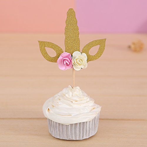 Set of 12 Golden Unicorn Cupcake Toppers Horn with Flower Kids' Party Decor - by Giuffi