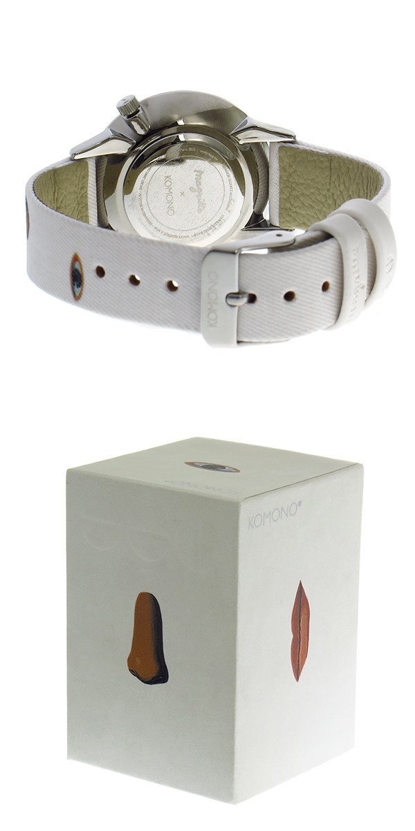 ブランドネームは世界中の「小物」を意味するワードの中から、日本語の「小物」選ばれて名づけられました。2009年、ベルギーのアントワープで生まれた、デザイナーのラフ・マエス氏とアントン・ヤンセンス氏による、腕時計とアイウェアをメインとするアクセサリーブランドです。この時計は、ベルギーのシュールレアリスムの画家で、のちのポップアートにも多大な影響を与えたR・マグリットの代表作をデザインに使用したコラボウォッチ。アートを身に着けられる逸品です。