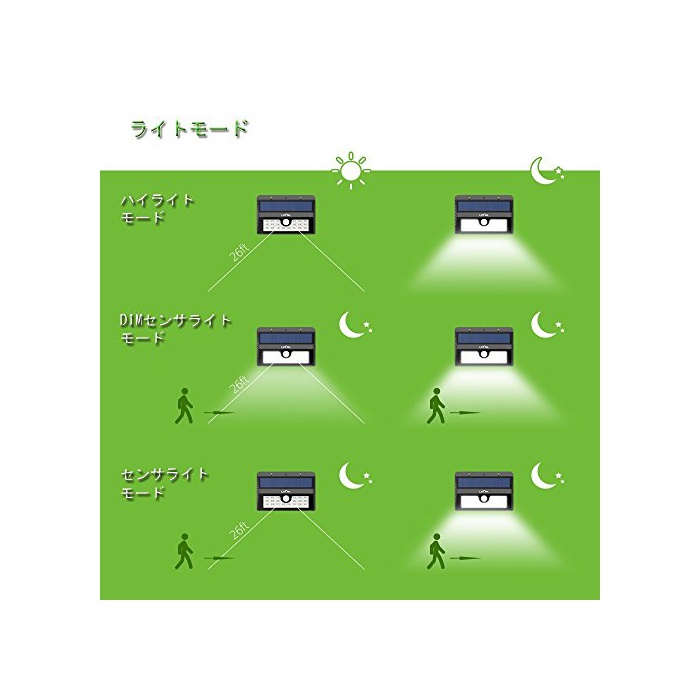 【3개의 지능 모드】하일라이트 모드,DIM라이트 모드,센서 라이트의 3종류의 스마트 모드가 있습니다.필요에 의해최적인 모드를 선택할 수 있습니다.인감센서와 명암 센서가 탑재됩니다.밤이 되면 자동적으로 점등합니다.사람의 움직임이 감지되면 자동적으로 상야등 모드부터 전등모드로 전환합니다.