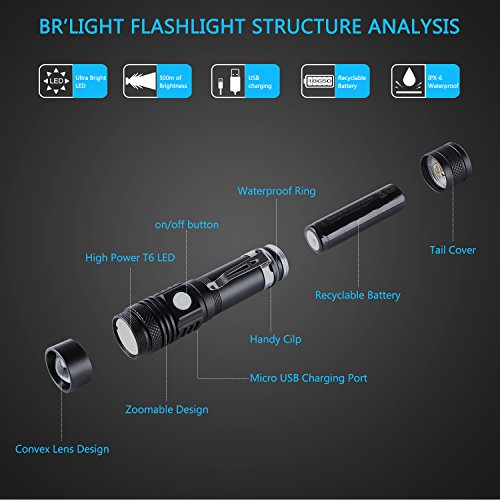 Br'Light Super Bright Mini Tactical Flashlight, Micro-USB Rechargeable (18650 Battery Included), Zoomable, Water-Resistant, 3 Light Modes, Belt Clip Flashlight for Outdoors