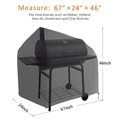 - Wide Compatibility. Heavy-duty protective grill cover measures: 67 x 24 x 46 inch. Check your grill's dimensions for proper fit. This gas grill cover fits most brand like Holland, Jenn Air, Brinkmann and Char Broil