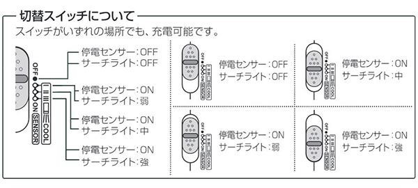 | 仕様 | 充電電源:AC100V 50/60Hz 消費電力:0.5W 使用電池:専用ニッケル水素電池3.6V 充電時間:約20時間 連続使用時間(約)/強:1.5時間以上、中:10時間以上、弱:20時間以上 使用温度範囲:5~35度 光源/サーチライト:白色LED×1 |