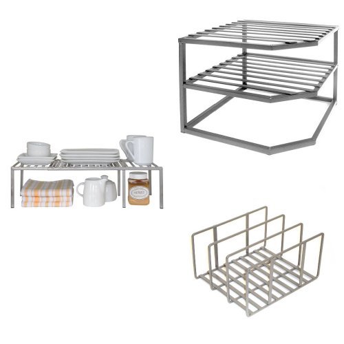 Seville Classics Expandable Kitchen Counter and Cabinet Shelf & Seville Classics 2-Tier Corner Shelf Counter and Cabinet Organizer, Platinum & Seville Classics Kitchen Pantry and Cabinet Organizer