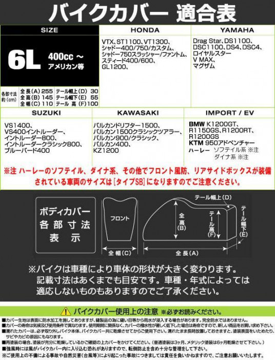 | 空気を通し、湿気を寄せ付けない透湿4層構造の特殊生地を使用した、画期的なボディカバー☆生地全体が呼吸をするように空気を通すため、一度濡れてもすぐに乾きます。また、マフラー部分には「溶けない生地」を使用。従来のバイクカバーは走行後すぐにカバーを掛けるとマフラーの熱で溶けてしまっていましたが、その問題も解消しました。軽くて着脱がしやすく、優れた強度を兼ね備えたバイクカバーです!! |