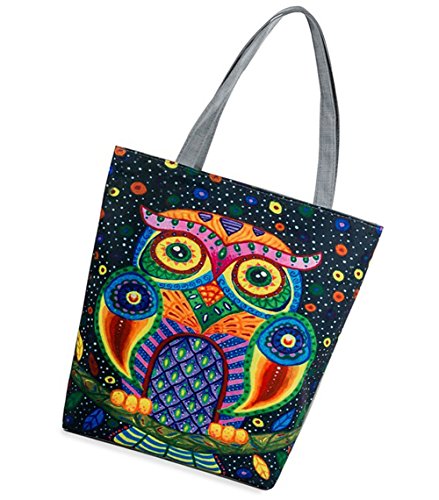 mossty Women Fashion Owl Pattern Handbag Canvas Shoulder Bag Zipper Shopping Tote Bag