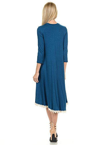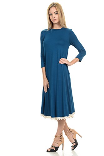 This dress features 3/4 sleeves, crew neckline, midi lenght and crochet lace trim at the bottom. It is made with a soft jersey knit that will create a beautigul drape.