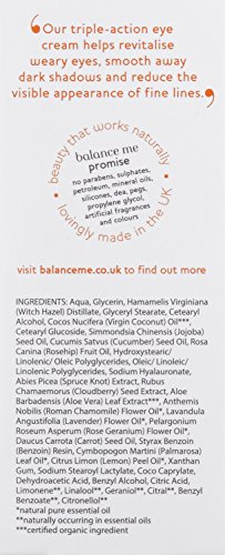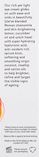 Revive tired eyes with Balance Me Wonder Eye Cream a skin brightening treat that also smoothes away dark shadows and fine lines with natural hydrating skin nourishment. Why use three products when one will do the job very nicely! Treat tired eyes to a threeinone naturally active eye cream with Balance Me Wonder Eye Cream a gentle but effective way to brighten and smooth the delicate skin around your eyes. A delicate easily absorbed formula with Roman chamomile skinbrightening lemon cucumber oil and witch hazel hydrating hyaluronic acid antioxidant spruce knot softening and smoothing virgin coconut rosehip and carrot oils. Directions of use Lightly pat and smooth around the eye twice a day after moisturising.Feature