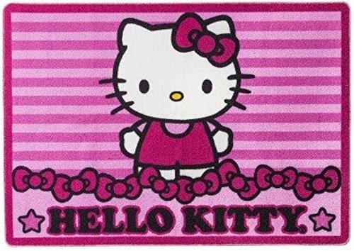 Hello Kitty Large Accent Floor Rug. Featuring Hello Kitty, Dark pink stripes on pink background, Contrasting pink bows, and "Hello Kitty" written in Black Bold letters.