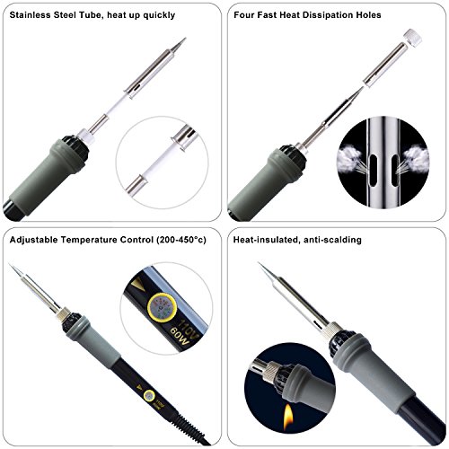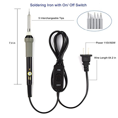 Soldering Iron Kit with On/Off Switch 60W 110V Adjustable Temperature Welding Soldering Iron, 5pcs Tips, Solder Sucker, Solder Wire, Tweezers, Desoldering Wick, Iron Stand and Sponge with Tool Case