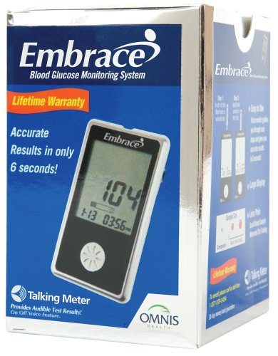Embrace Blood Glucose Meter- Provides Audible Test Results in English or Spanish, On Off Audible Feature, Accurate Results in only 6 Seconds, Lifetime Warranty, Small Sample Size, Talking monitor guides you through easy steps and gives you accurate results in 6 seconds!Feature