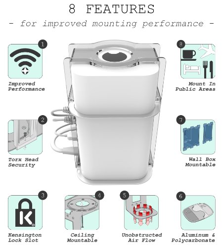 - Feature : 6 mounting holes allowing secure installation to any flat surface or direct mounting onto US standard single/dual wall box / Polycarbonate security cap (supporting standard Kensington lock) allows peace of mind in mounting your AP in any location. / High quality aluminum and PC materials deters theft, and provides ultra-safe ceiling mounting, without having any negative impact on the WiFi performance. The AirPort Express/Time Capsule antennas are placed at the highest point [on sheet aluminum shielding] within the plastic housing, far above the level of Airbase. / Airbase is designed to optimize the 11n/ac speed, so the Apple Extreme and Time Capsule can be facing in whichever direction on any flat surface to enhance the data speed and greatly extend the range. / Polycarbonate security cap: http://www.amazon.com/gp/product/B00L5JFW4E