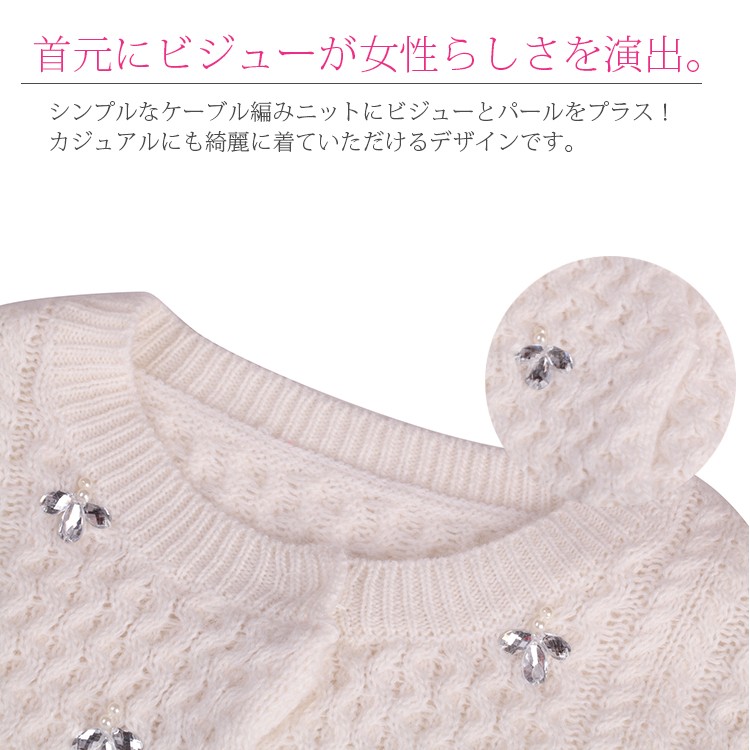 | スタッフコメント | ビジュー&パール付きで華やか大人可愛いニット!! さらっと着るだけオシャレ度UP 暖かニット素材で保温性◎ふわもこ、見た目の甘さが大人可愛いニット! ふんわり滑らかな手触りで着心地抜群の糸を選びました! ビジューで顔周りがグッと華やかになるので、アクセサリーはなくてもOKです! |