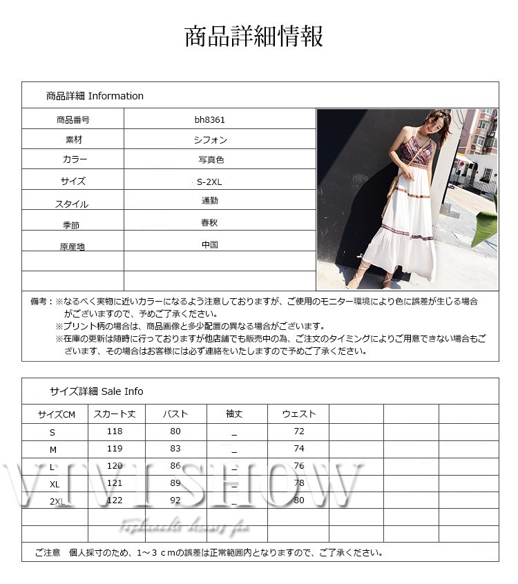 ■素材:シフォン■カラー:写真色■サイズ:Sバスト80スカート丈118ウェスト72Mバスト83スカート丈119ウェスト74Lバスト86スカート丈120ウェスト76XLバスト89スカート丈121ウェスト782XLバスト92スカート丈122ウェスト80■原産地:中国