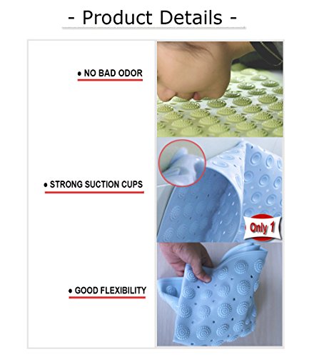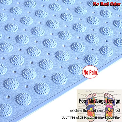 FEATURES: Premium TPR environmental material,soft,lightweight; 15 W x 30 L inches size fits any size bath tub; Unique foot massage design with multiple functions; With many drainage holes keep water flowing through the bath mat; Unlike other bath mat on the market,this mat have a light aroma with it,no bad odor.