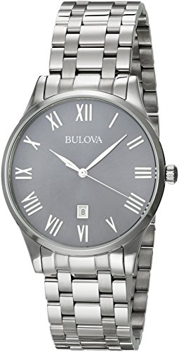 Stainless steel case. Stainless steel bracelet with double-press deployant release. Round face. Three-hand analog display with quartz movement. Gunmetal dial features silver-tone hands and hour markers, date display window, and Bulova detailing. Water resistant 30 meters. Display case included. Imported. Your Bulova watch is covered by Bulova's 3-Year Global Warranty.Feature